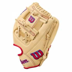 Featuring a cream colorway with red and royal accents, the glove delivers a polished, professional appearance. Bold Wilson logos add a modern touch while maintaining a classic baseball aesthetic that looks great on the field.