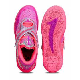 The vibrant "World Tour" colorway stands out with a striking pink base and exclusive details: an iridescent barbed wire design wrapped around the heel, echoing Melo’s tattoos, and a repeated “1” motif that highlights his One of One identity. The outsole features molded graphics, including a skull and the number "1", reinforcing the shoe’s edgy and unique personality.